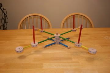 The picture doesn't do justice to the tangles and knots, wow. It took a couple hours to get it untangled. I didn't want to try to wind another ball without a swift but I don't have a swift. I like immediate gratification so I didn't want to wait and buy one online so I hit up Brandon's Tinker Toys.